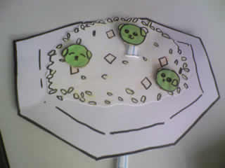 「ねぇ~しってるぅ~?」でおなじみの豆しばをご存知ですか? バンダイの「∞エダマメ 豆しばバージョン」のCMを見てからコーチンが 豆しばをとっても好きになりました。 「ママ、豆しばを作って!」といわれたので作りました。 画用紙とダンボールで作っています。 ↓下の画像をクリックしてください。豆しばが顔を出します ![]() ↓は「グリーンピースしば」 コーチンより、「チャーハンから飛び出すグリーンピースしば」と リクエストがありました。 そして、「グリーンピースしばの裏にストローを貼ってピヨーンとしよう」 と言うのです。なかなかのアイディアです 真ん中のグリーンピースしばが手動でピヨーンとなります。 何度も「豆しばごっこ」をやりました。 「豆しば」ホームページ↓です。 http://dogatch.jp/anime_kids/mameshiba/top.html |